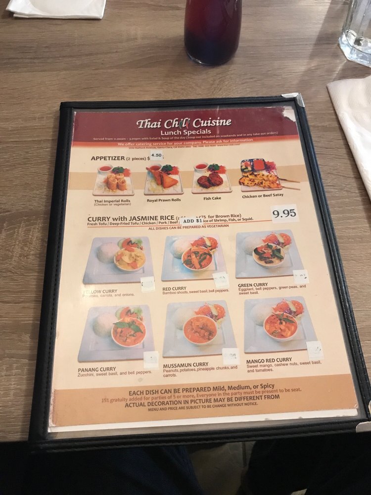 Thai Chili Cuisine is a Thai restaurant located in Santa Clara, CA, offering a variety of authentic Thai dishes, including delicious curries, refreshing beverages, and tempting desserts. The restaurant provides a cozy and inviting atmosphere, perfect for a casual dining experience with friends or family. With wheelchair accessibility, vegan and vegetarian options, and welcoming gender-neutral restrooms, Thai Chili Cuisine caters to all types of diners. Their house curries, such as Panang Curry and Red Curry with Pineapple, are highly praised by customers for their bold flavors and fresh ingredients. The restaurant's dedication to providing sustainable and environmentally friendly practices, such as plastic-free packaging and compostable containers, adds to its appeal. Overall, Thai Chili Cuisine offers a memorable dining experience that combines flavorful dishes, excellent service, and a welcoming ambiance.