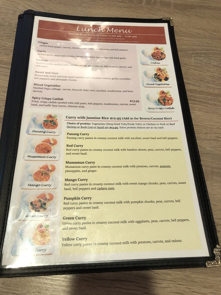 Red curry with coconut milk, mushrooms, zucchini, kaffir leaves, green peas, and bell peppers. $10.95 for prawns or fish. $12.95 for salmon. $14.95 for mixed seafood.